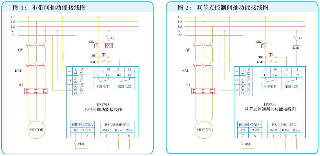 IP3755低壓電機(jī)再起動(dòng)控制器在間抽工作模式下,用戶根據(jù)需要可自由設(shè)置電機(jī)運(yùn)行時(shí)間和停止時(shí)間(最小計(jì)時(shí)單位為6分鐘),同時(shí)可選擇單接點(diǎn)控制方式或雙接點(diǎn)控制方式。
