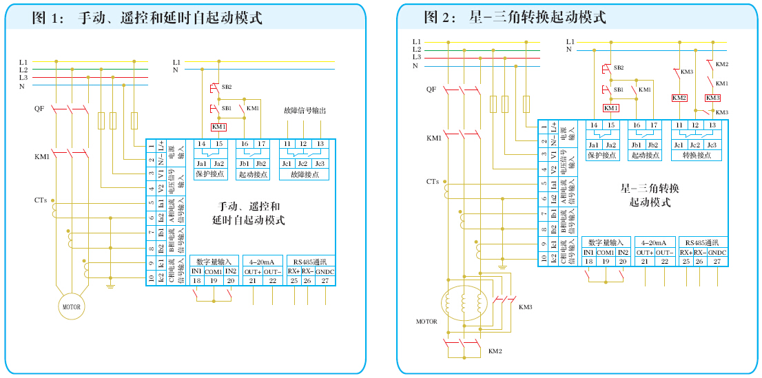 具有三組繼電器輸出,能滿足電機(jī)直接起動(dòng)、星/三角起動(dòng)、來電延時(shí)自起動(dòng)、遠(yuǎn)方遙控起停、保護(hù)停機(jī)等,任意設(shè)定來電延時(shí)自起動(dòng)時(shí)間(0~999.9秒),實(shí)現(xiàn)電機(jī)分批起動(dòng)。