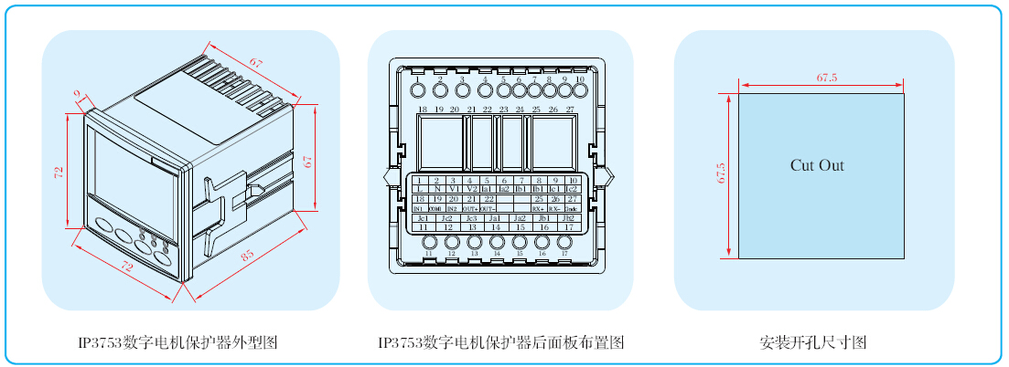 IP3753數(shù)字電機(jī)保護(hù)器(以下簡(jiǎn)稱保護(hù)器)主要用于保護(hù)交流電壓220V,頻率50Hz,電流1000A以下的各種交流電機(jī)。具有過載、堵轉(zhuǎn)、輕載、不平衡/缺相、過壓/欠壓、短路、接地等故障保護(hù)功能,并有最大允許分?jǐn)嚯娏鞅Wo(hù)以及參數(shù)測(cè)量、操作控制、遠(yuǎn)程通訊等功能。其采用互感器與主體分離的電流輸入方式,需配合專用或通用CT模塊一起使用。
