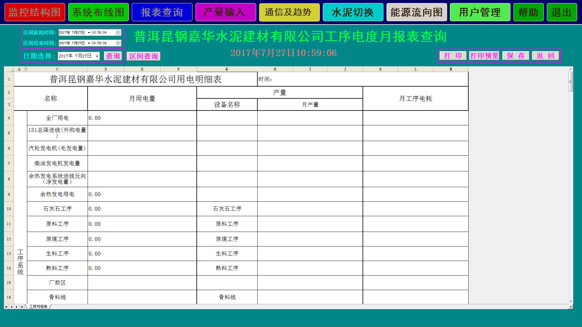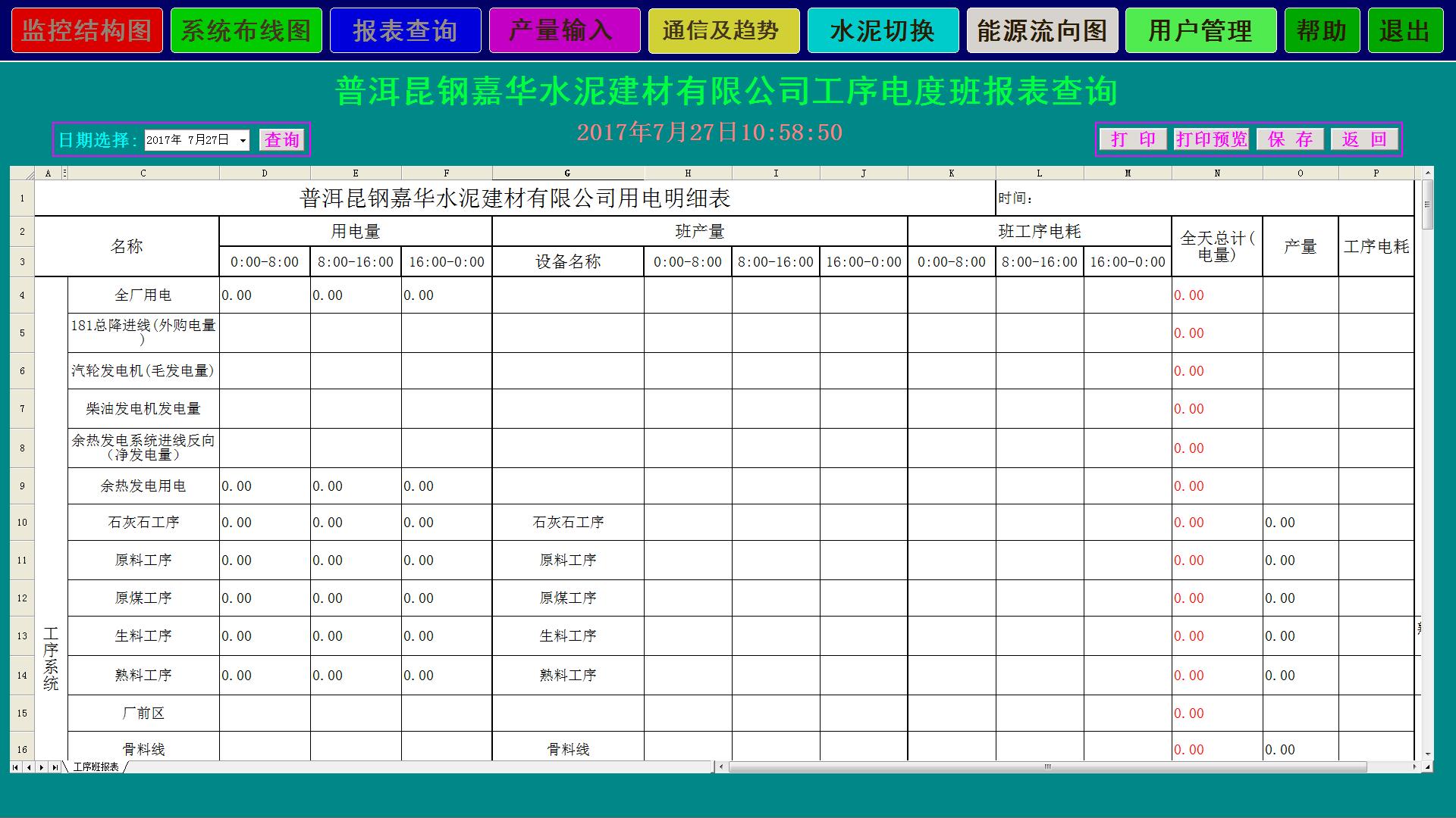 (5)各類報表均生成Excel文件可存儲及導出(日報及月報于次日0:00和次月26日0:00自動生成),要求實現(xiàn)通過手動輸入產(chǎn)量后自動算出各系統(tǒng)用電單耗;