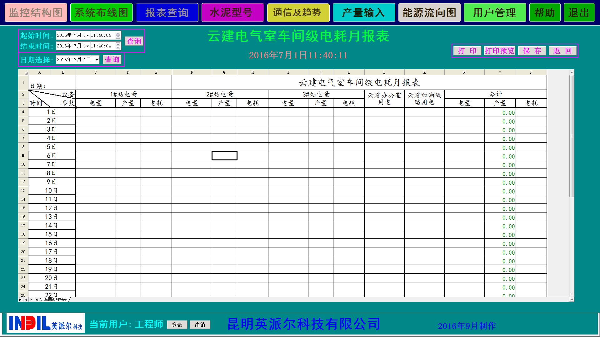 管理系統(tǒng)自動生成的電能信息統(tǒng)計圖形、曲線和報表,以班、日、周、月、年為周期的電能耗統(tǒng)計報表,報表類型分為電壓等級、車間、重要耗能設(shè)備三個層次,報表能以EXCEL類型導(dǎo)出。
