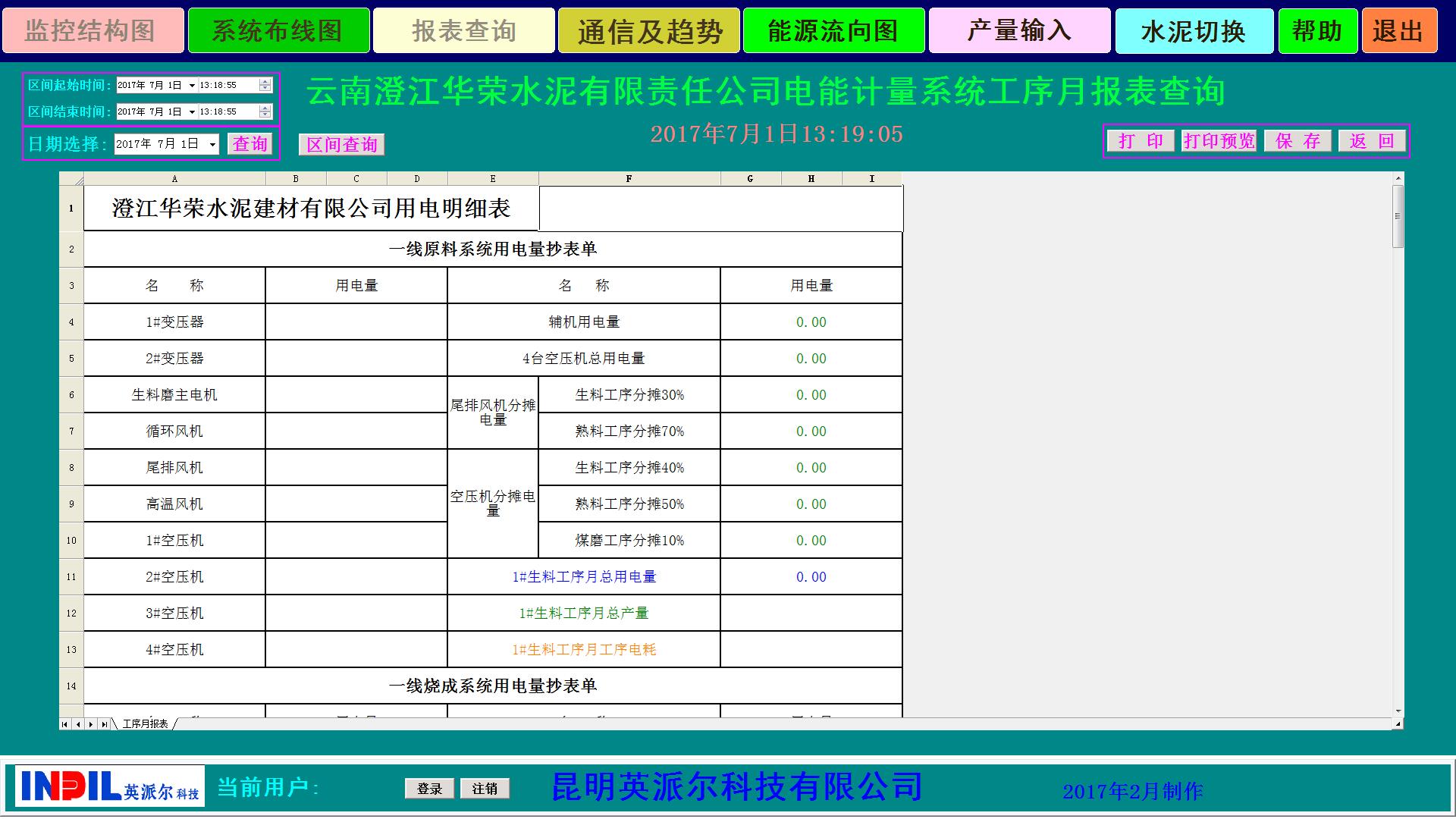 管理系統(tǒng)自動生成的電能信息統(tǒng)計圖形、曲線和報表,以班、日、周、月、年為周期的電能耗統(tǒng)計報表,報表類型分為電壓等級、車間、重要耗能設(shè)備三個層次,報表能以EXCEL類型導(dǎo)出。