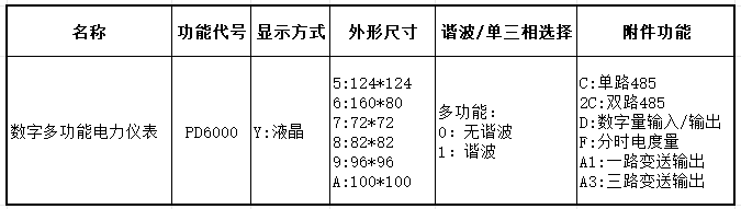 例:PD6000-Y90-CFA1表示96*96結(jié)構(gòu),不帶諧波,RS485通訊,帶變送輸出,帶分時電度量。